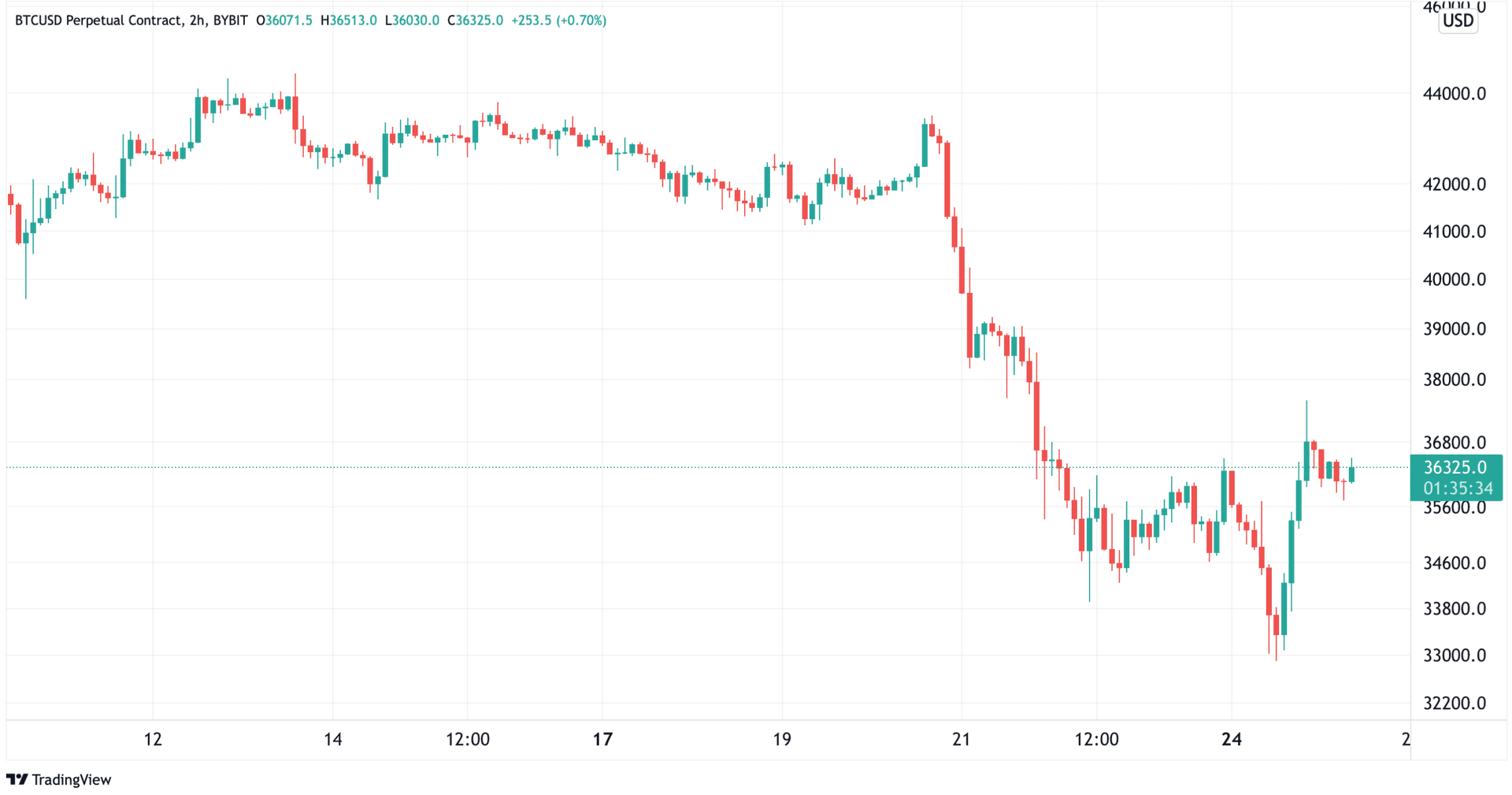 Det er to uker siden siste oppdatering og i løpet av de to ukene har det skjedd mye i markedet. Fra torsdag kveld 20. januar til mandag ettermiddag 24. januar falt bitcoin-kursen 24.34% fra 392 615 kroner ($43 500) til 296 945 kroner ($32 900). Siden i går ettermiddag har kursen hentet seg inn med 10% og ligger i skrivende stund på 327 827 kroner ($36 325).