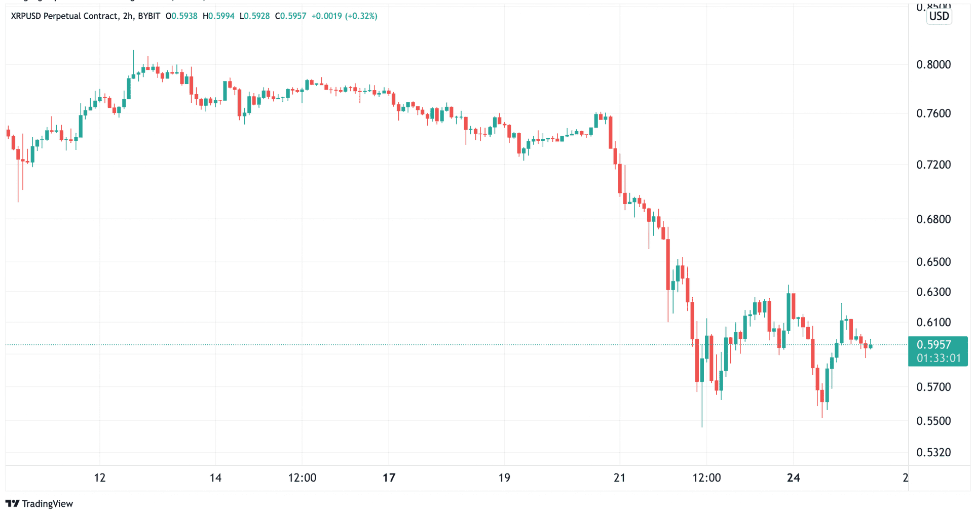 XRP hadde det tøft som resten av markedet og falt 28% fra 6,85 kroner ($0.76) til 4,87 kroner ($0.54) som er laveste kursen sett for XRP siden juni 2021. Kursen står i skrivende stund i 5,32 kroner ($0.59).