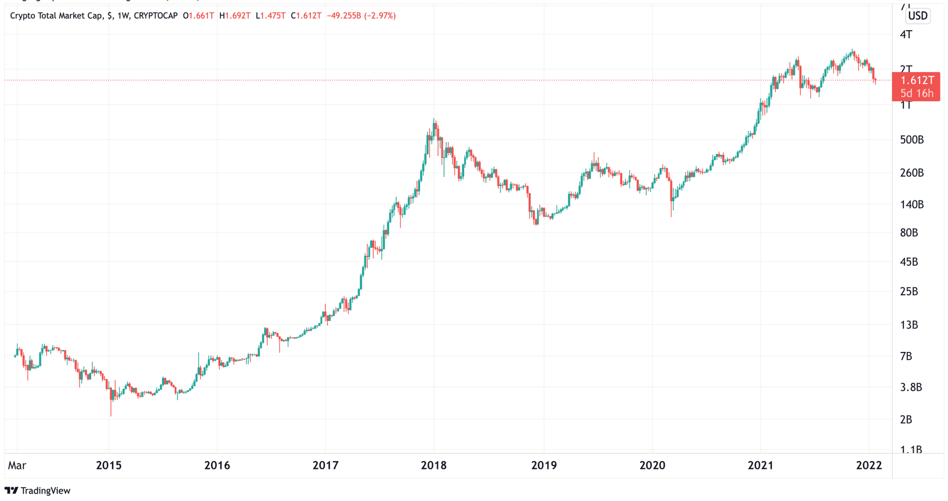 Grafen nedenfor viser den totale markedsverdien til alle kryptovalutaer lagt sammen. Den totale børsverdien til kryptomarkedet er i skrivende stund 14 536 967 640 000 kroner ($1.612 trillion).