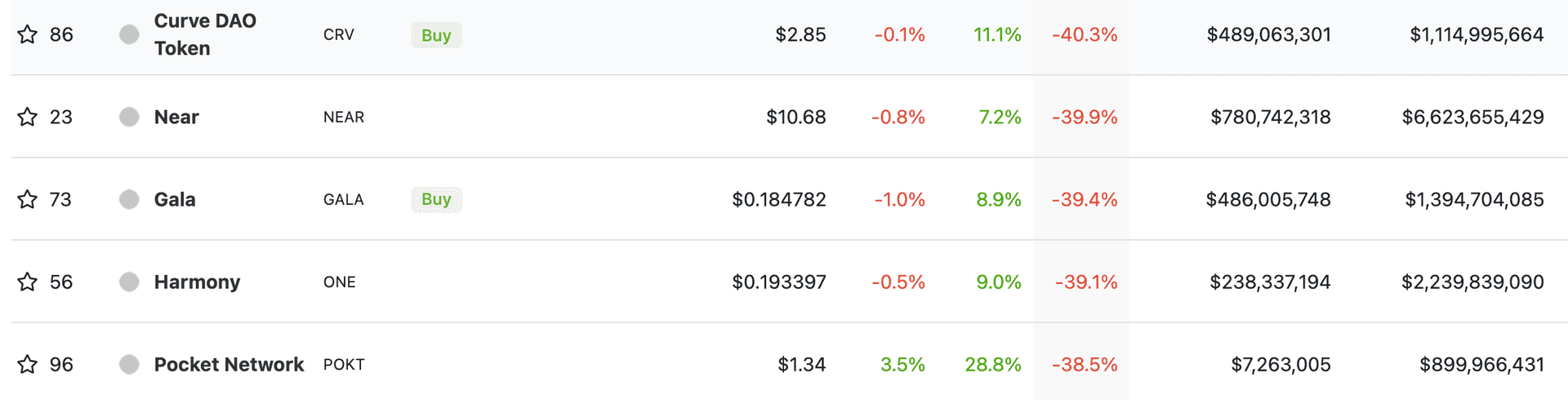 I et hav av blodrøde kryptovalutaer er Curve den som har falt mest med 40% denne uken. Rett bak følger Near, Gala, Harmony og Pocket Network.