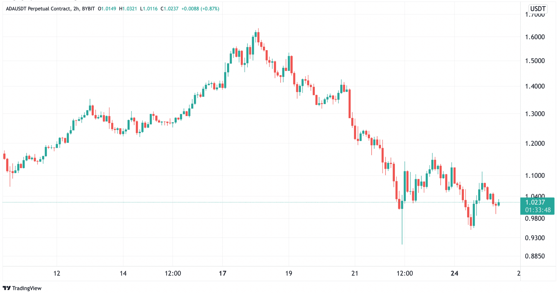 Ada hadde en sterk prisvekst forrige uke, noe som kan tenkes å ha med lanseringen av SundaeSwap å gjøre, den første desentralisert børsen på Cardano blokkjeden. I uke 2 steg kursen hele hele 53% fra 9,56 kroner ($1.06) til 14,71 kroner ($1.63), men da bitcoin falt var også fallhøyden større for ada. Fra tirsdag morgen 18. januar til lørdag formiddag 22. januar falt kursen 44%, fra 14,71 ($1.63) til 8,21 kroner ($0.91). I skrivende stund står kursen i 9,21 kroner ($1.02).