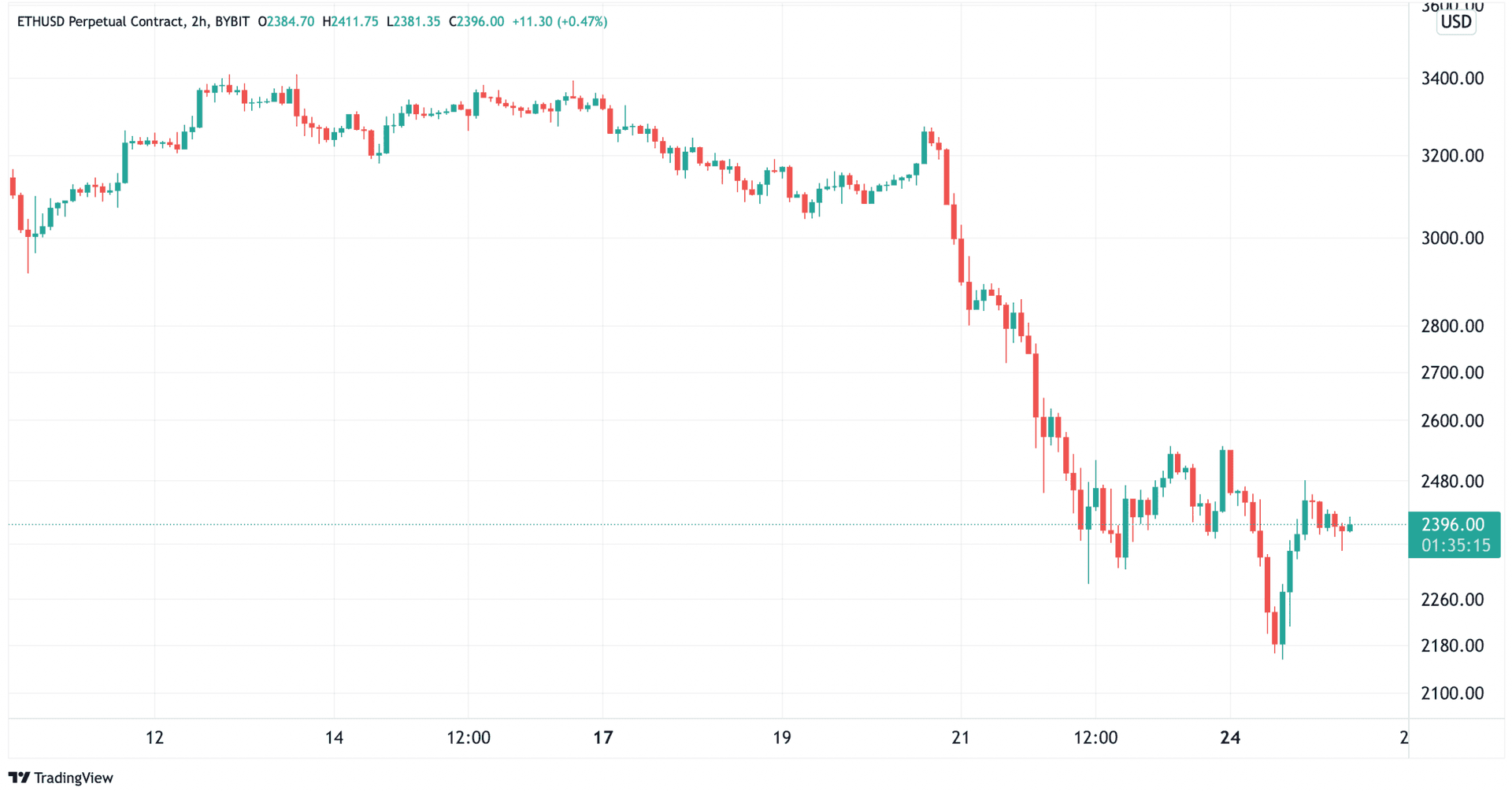 Når bitcoin faller er det veldig få kryptovalutaer som står imot og ether var ikke en av de. Fra torsdag til mandag falt kursen fra 27 516 kroner ($3 270) til 19 450 kroner ($2 155), et fall som tilsvarer hele 34%. I skrivende stund står kursen i 21 627 kroner ($2 396), en pris som ikke er sett siden juli 2021.