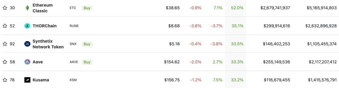 On the list of this week's top 5 winners, we find Ethereum Classic at the top, which in the last 7 days has increased by as much as 52%. Number two on the list is THORchain which was also one of the winners two weeks ago. THORchain has now increased by almost 200% since February 24th.