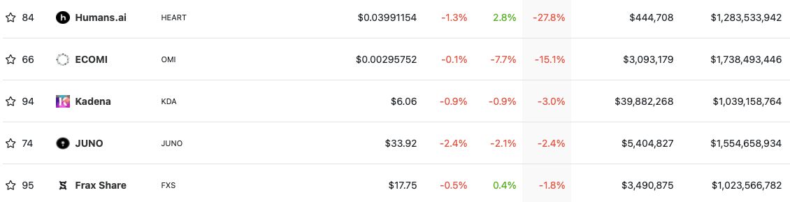 In an otherwise relatively green week, Humans.ai is the clear loser and has fallen by 27.8% in the last seven days. Behind Humans.ai we find ECOMI which has fallen by 15.1%, Kadena with 3%, JUNO with 2.4% and Frax Share which fell 1.8%.