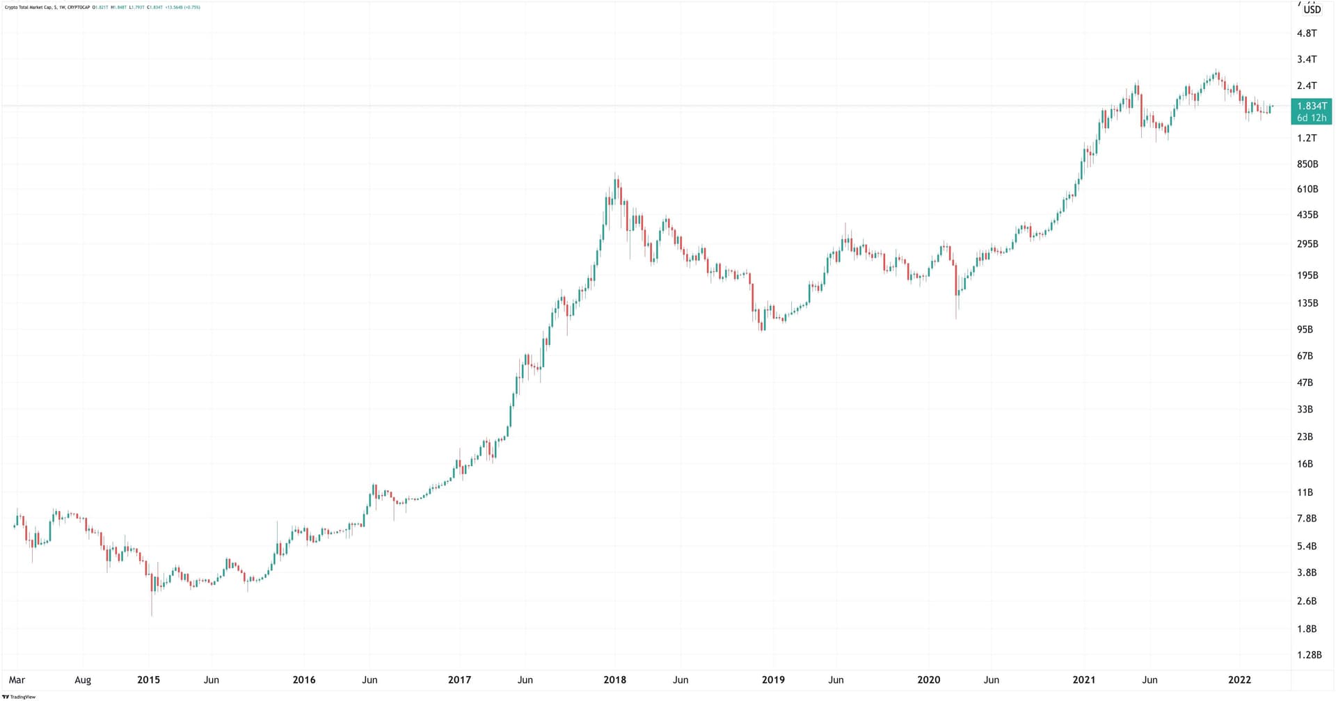 The chart below shows the total market value of all cryptocurrencies added together. The total market capitalization of the crypto market at the time of writing is 16,018,504,460,000 kroner ($1,834 trillion).