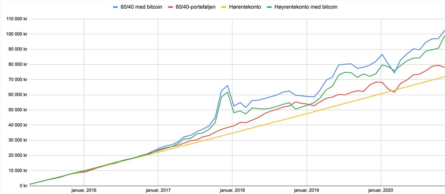 - 60/40 with bitcoin: 57% in Nordnet Indeksfond, 3% in bitcoin and 40% in high-interest accounts (2% interest).