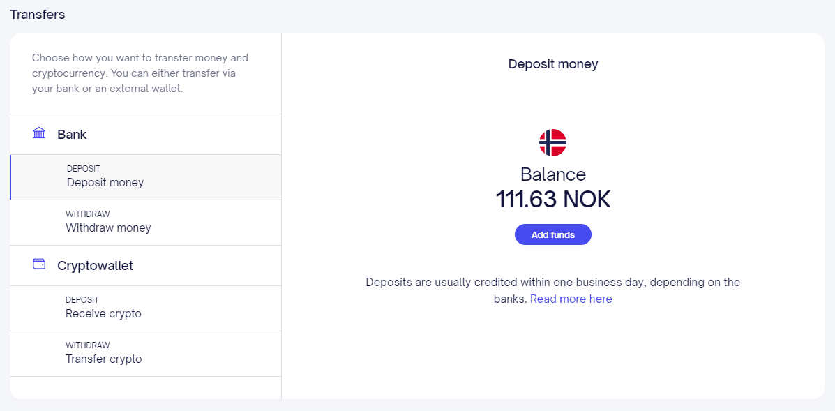 In the Firi app, you can find the deposit page under the Overview tab, and by pressing Deposit money. If you use Firi via a web browser, this can be found on the Main Account tab where it says Deposit.