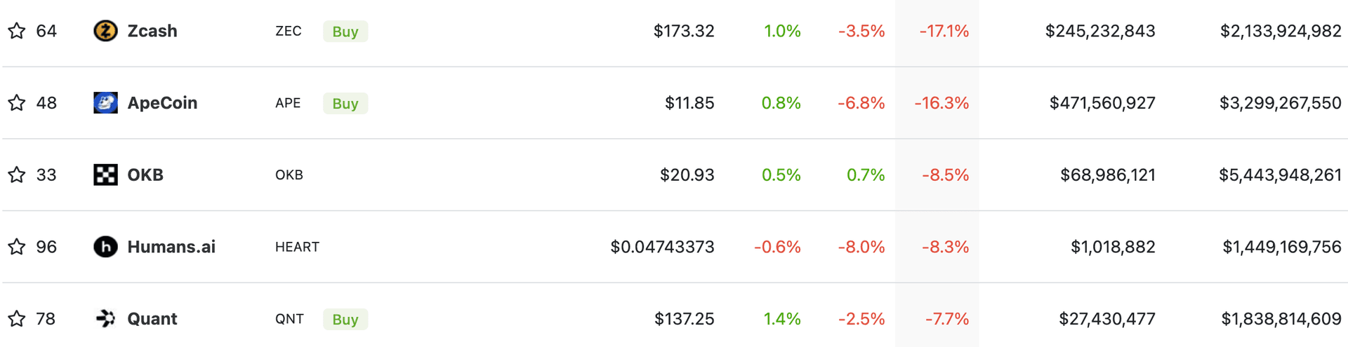 Blant ukens tapere er det Zcash som topper listen med et kursfall på 17% de siste 7 dagene. På andreplass finner vi ApeCoin, tokenen til den populære NFT-kolleksjonen Bored Ape Yatch Club, som har falt 16%.