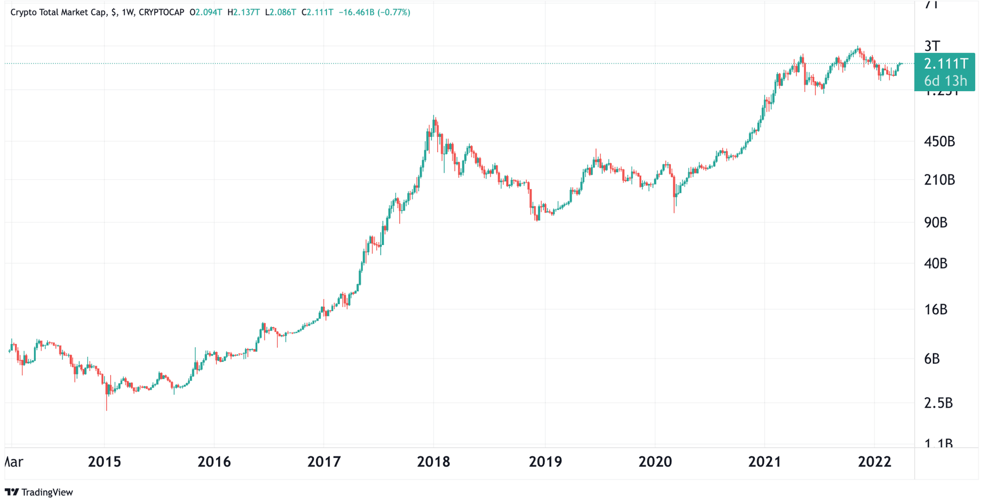 Grafen nedenfor viser den totale markedsverdien til alle kryptovalutaer lagt sammen. Den totale børsverdien til kryptomarkedet er i skrivende stund 18 323 809 700 000 000 000 kroner ($2.11 trillion).