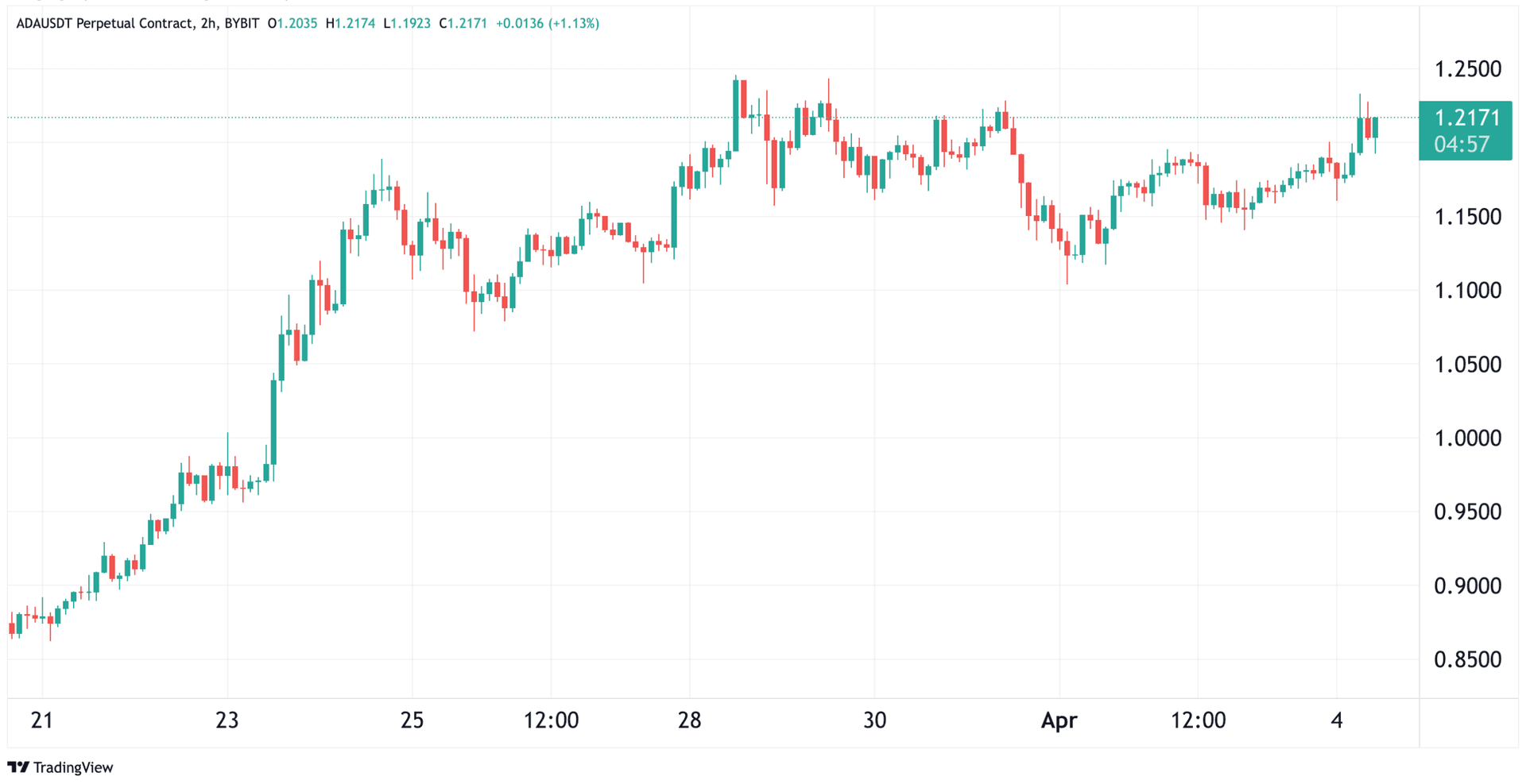 ADA har de siste ukene vært en av de sterkeste kryptovalutaene og siden bunnen på 6,4 kroner ($0.74) som ble satt i slutten av februar har kursen økt med over 60%. Mandag forrige uke nådde kursen opp i 10,78 kroner ($1.24), før den falt ned mot 9 kroner ($1,03) igjen. I skrivende stund står kursen i 10,5 kroner ($1.21).
