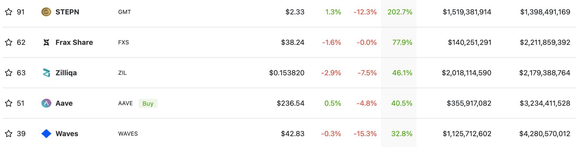 På listen over ukens vinnere finner vi en soleklar viner i STEPN som de siste syv dagene har økt med hele 202%. Flere andre prosjekter har også hatt nevneverdige prisstigninger, som blant annet Frax Share med 77% og Zilliqa med 46%.