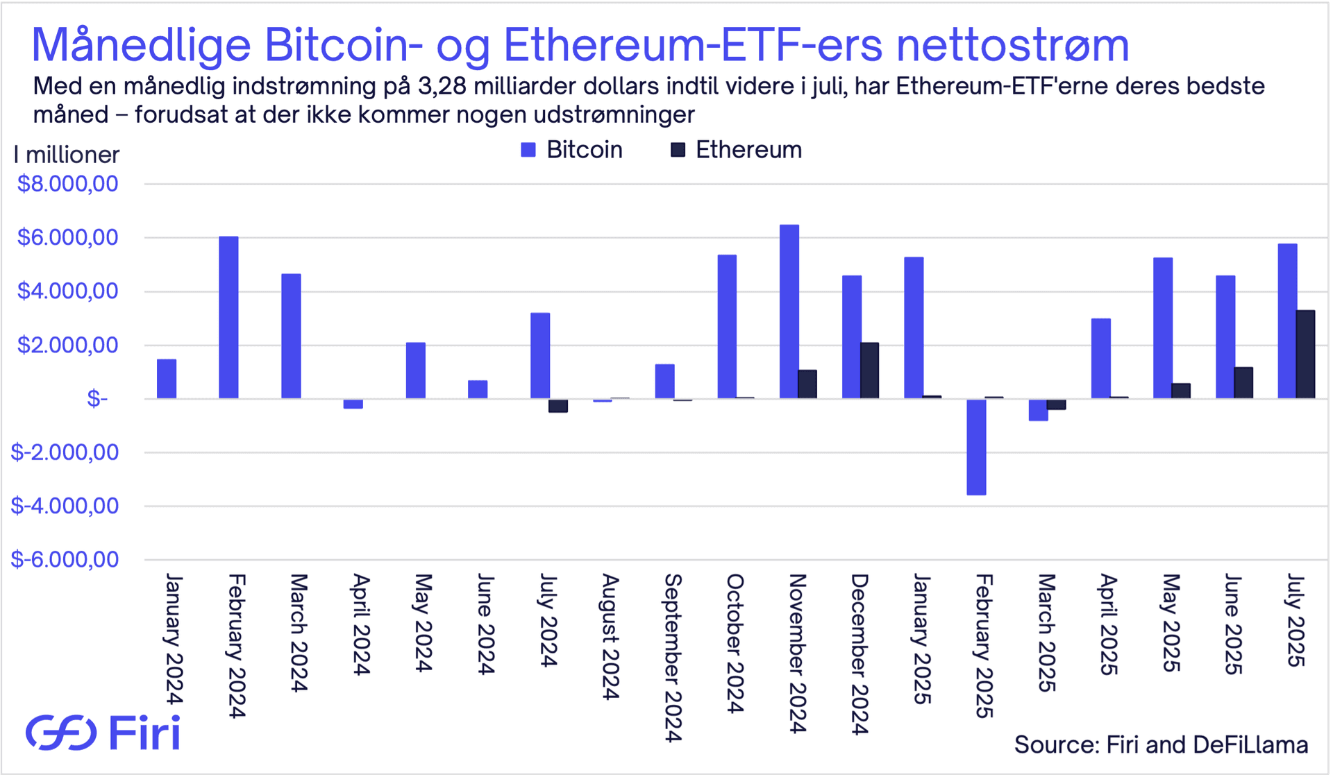 - Juli måneds tilstrømning på 3,28 mia. dollars sætter kursen mod den bedste måned nogensinde for Ethereum-ETF'er og overgår december 2024s milepæl på 2,08 mia. dollars. Samtidig ansøger BlackRocks ETF om at stake dets underliggende Ether.