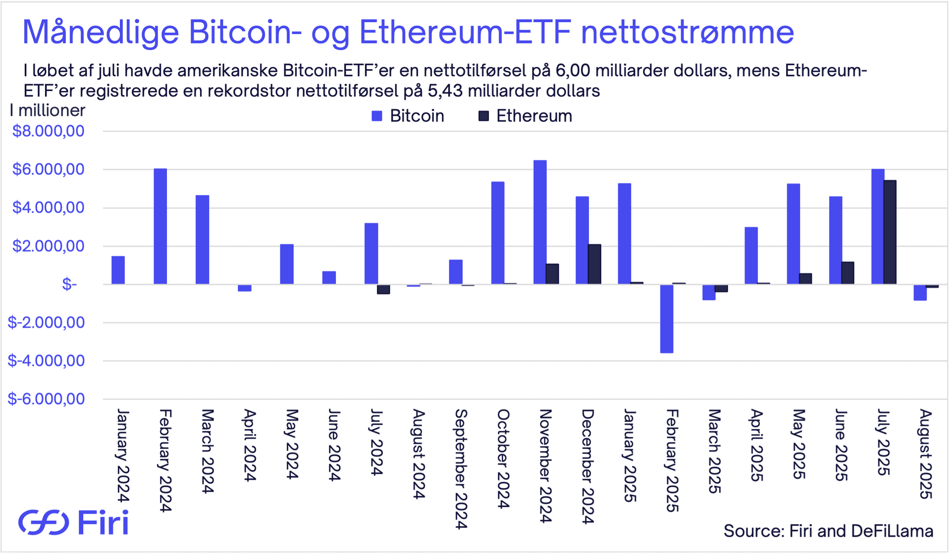 Graf 3: Månedlige amerikanske Bitcoin- og Ethereum-ETF nettostrømme