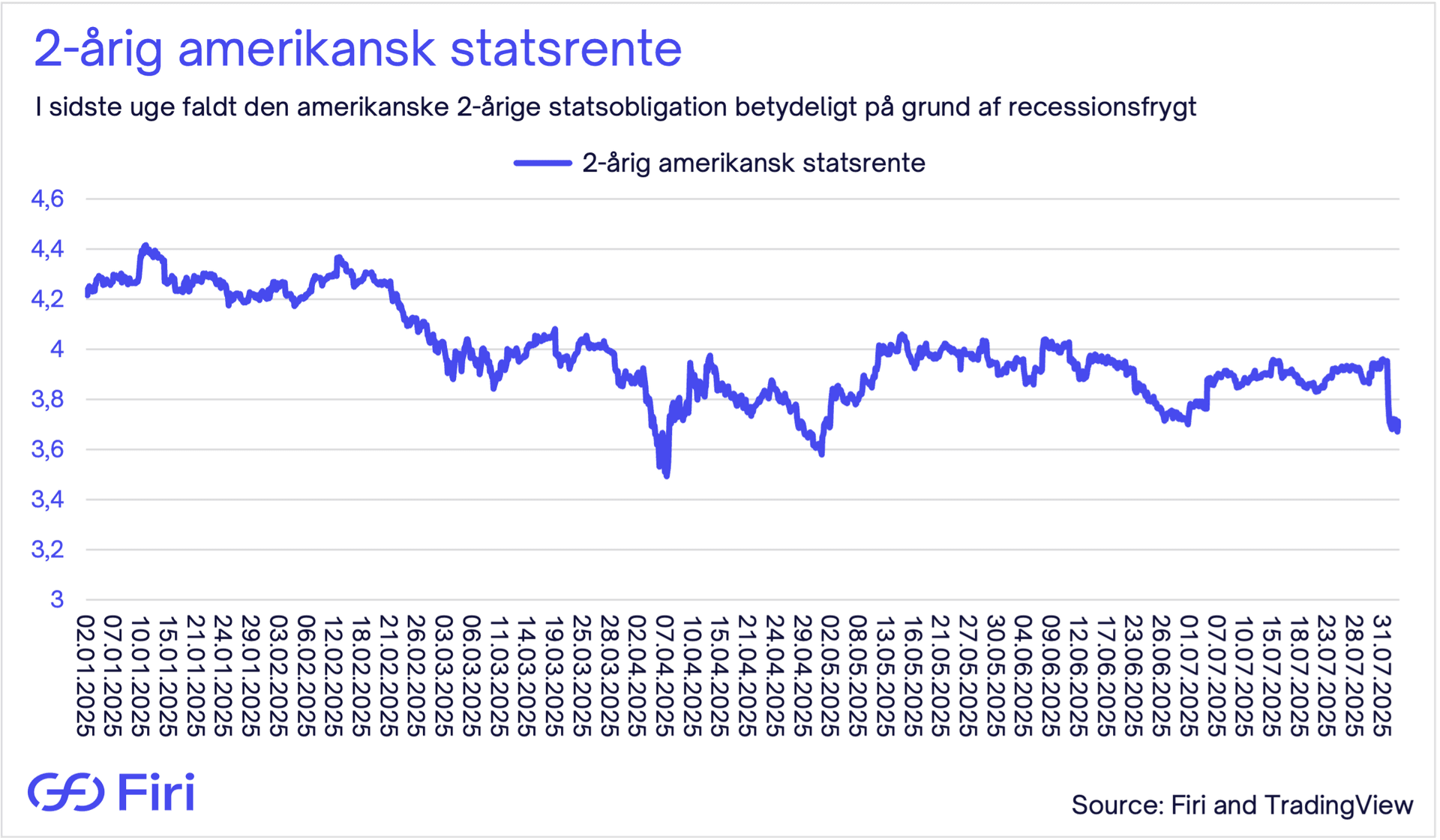 Den amerikanske 2-årige statsrentes kollaps efter fredagens jobrapport understreger voksende panik i markederne. Investorer forventer nu aggressive rentenedsættelser fra den amerikanske centralbank (Fed) – ikke på grund af faldende inflation, men drevet af bekymringer over aftagende vækst eller endda en potentiel recession.