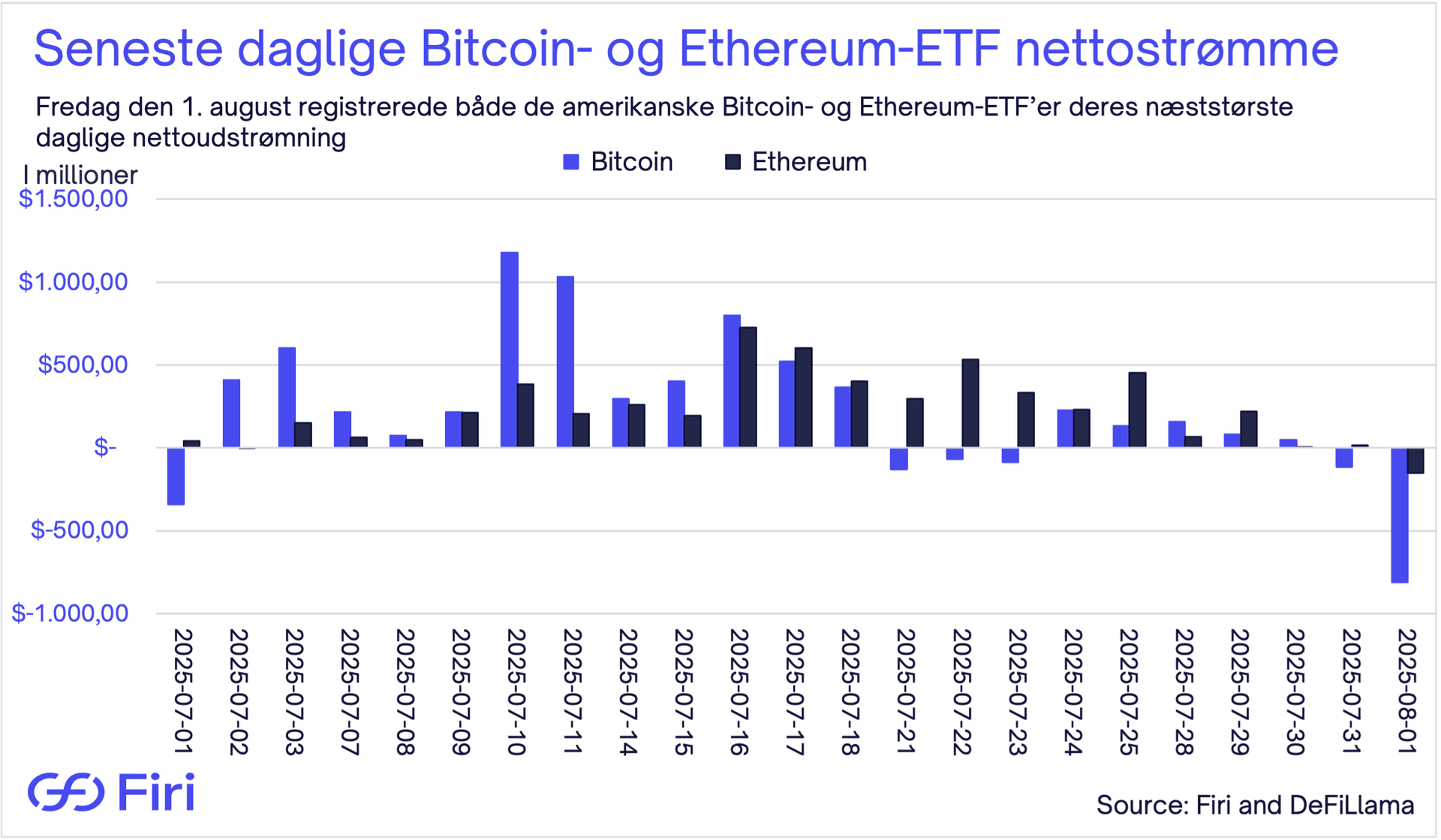 Den stærke juli-præstation stoppede dog brat indtil videre i august. Både amerikanske Bitcoin- og Ethereum-ETF'er registrerede deres næststørste daglige udstrømning for i år fredag den 1. august. Bitcoin-ETF'er oplevede en nettoudstrømning på 812,3 millioner dollar den dag, mens Ethereum-ETF'er så 152,3 millioner dollar forlade fondene.