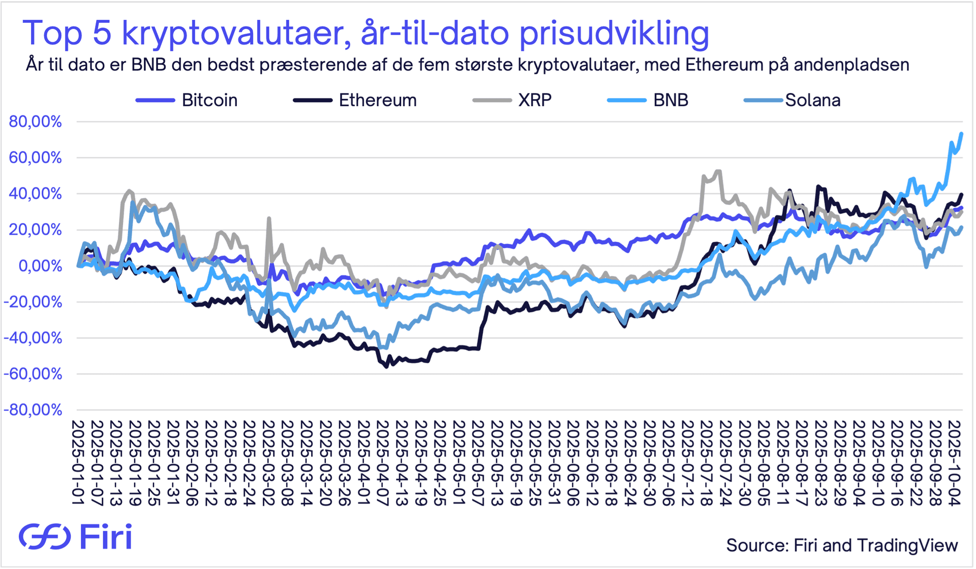 - Bitcoin nåede et rekordniveau på 125.700 dollar søndag, drevet af den nylige amerikanske rentenedsættelse, stærke aktiemarkeder, solide amerikanske ETF-tilstrømninger og oktobers historisk positive udvikling for kryptovaluta, blandt andre faktorer.