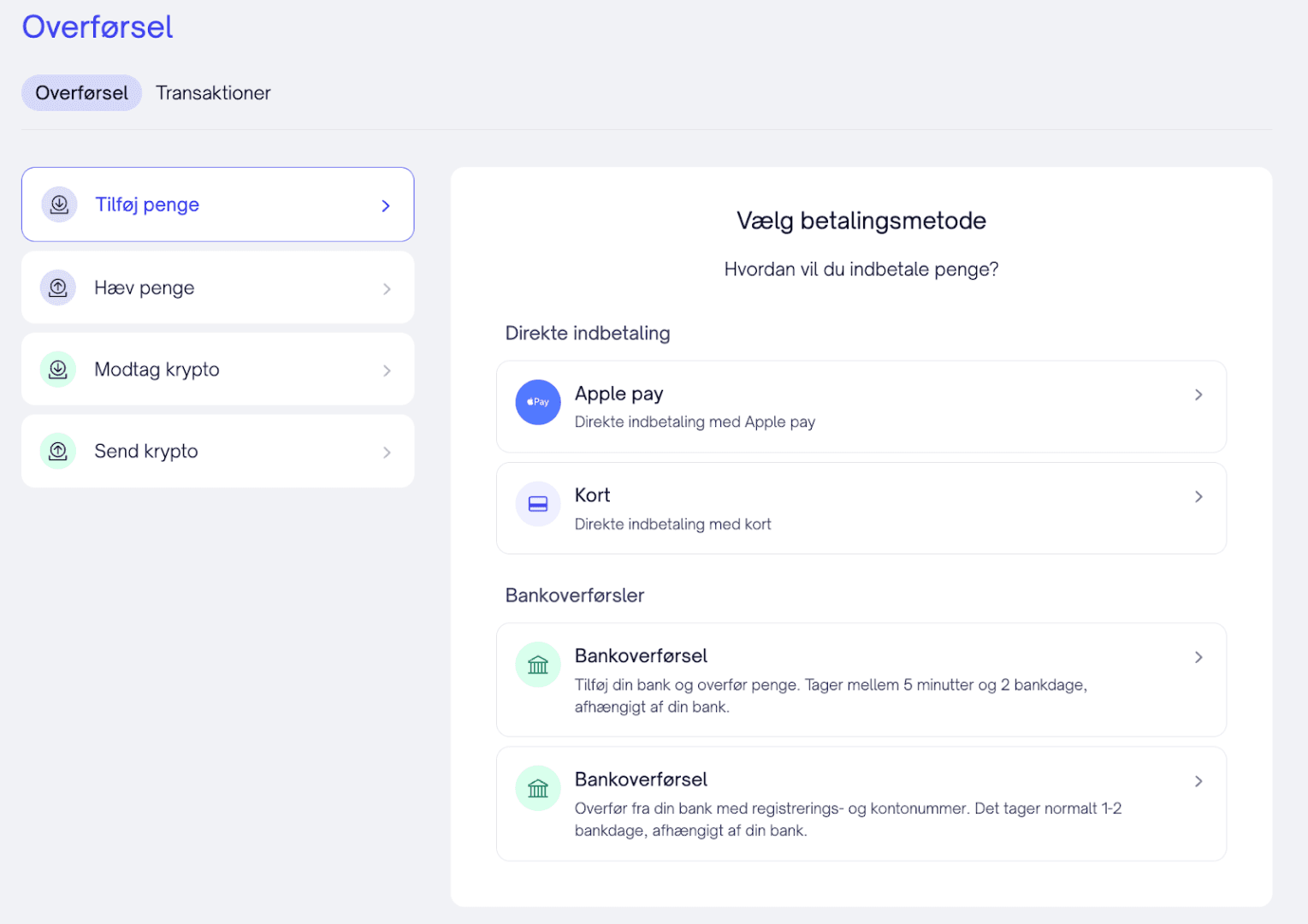 I Firi-appen finder du siden for indskud under Oversigt-fanen, og ved at trykke på "Indsæt penge". På vores hjemmeside klikker du på “Tilføj penge” øverst til højre på siden.