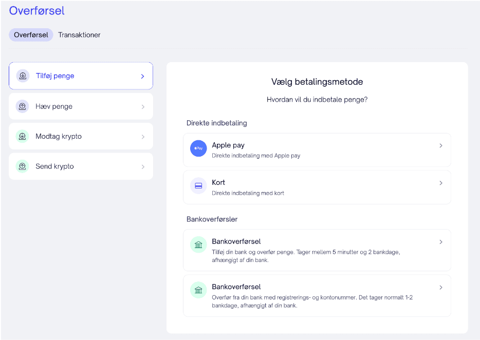 I Firi-appen finder du siden for indskud under Oversigt-fanen, og ved at trykke på "Indsæt penge". På vores hjemmeside klikker du på “Tilføj penge” øverst til højre på siden.