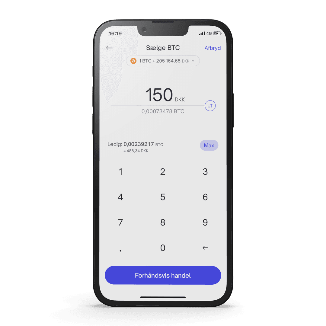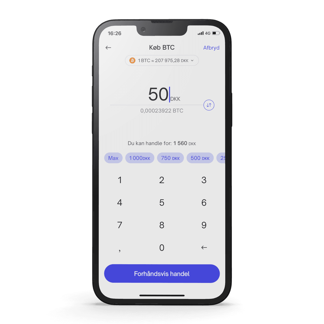 Et eksempel: Du ønsker at købe bitcoin for 1000 kroner. Du åbner vores app og vælger Handel og derefter Køb krypto. Herefter vælger du bitcoin og indtaster at du vil købe bitcoin for 1000 kroner, derefter bekræfter du handlen.