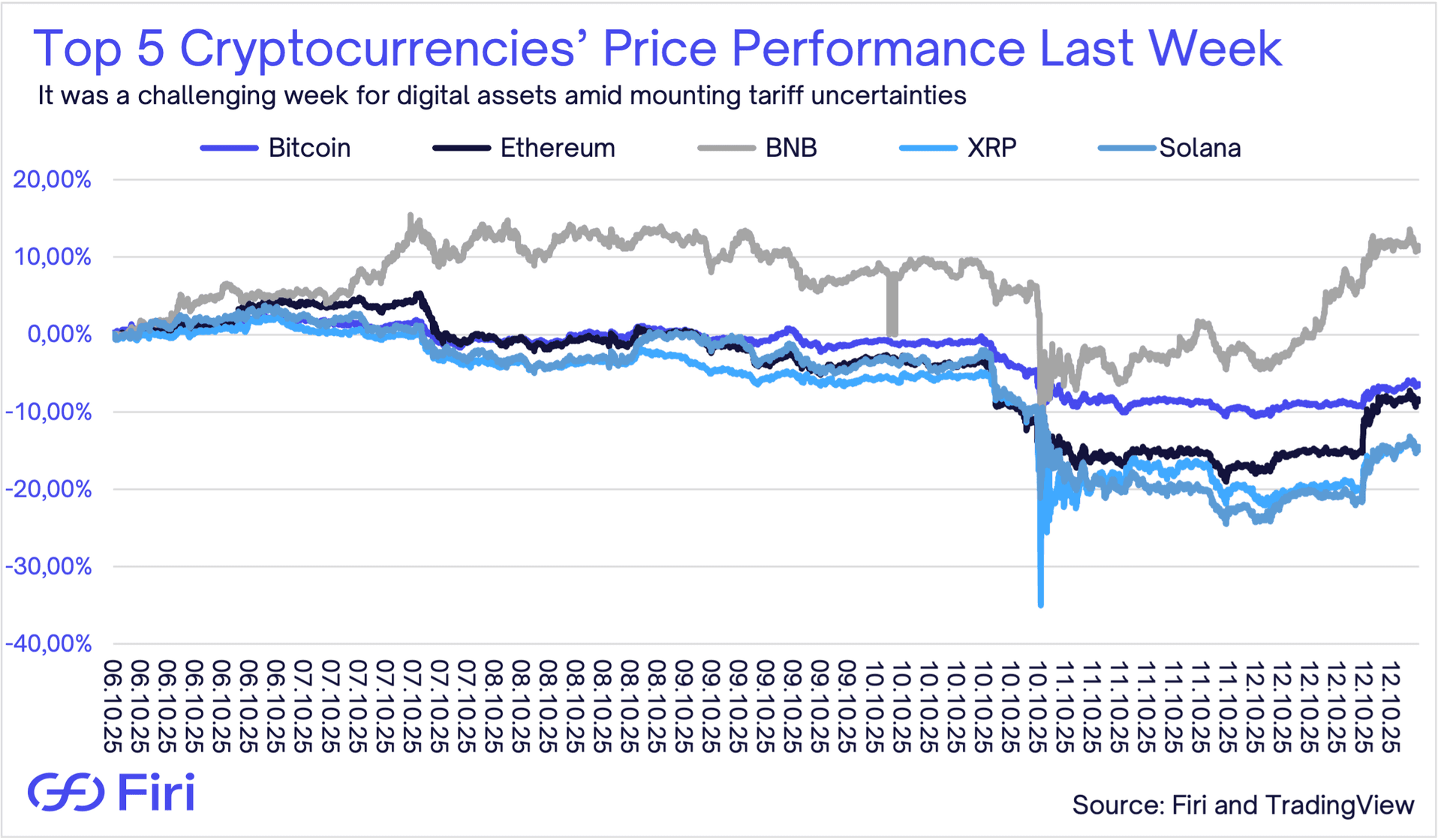 - These tariff fears triggered the largest crypto liquidation on record on Friday, with XRP down by as much as 35% and Solana down 20% as leveraged trades unwound rapidly.