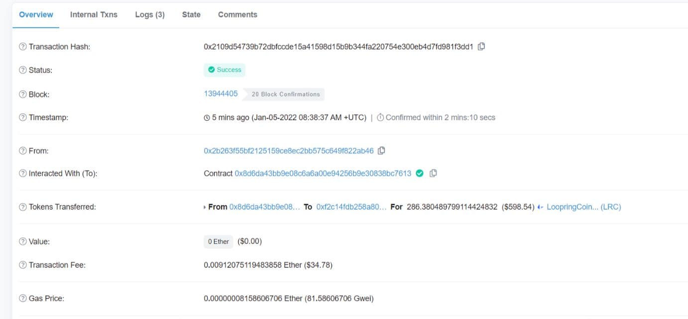 Under feltet “From” ser vi ethereum adressen som har utført transaksjonen. Denne tilhører en ethereum wallet, men personen som eier denne er anonym. Det vi derimot kan se er at denne lommeboken har overført 286.38 LRC (Loopring Coin) til en verdi av $598,54 til denne walleten fra en annen adresse, og “transaction fee” og “gas price” under gir info om transaksjonskostnadene.