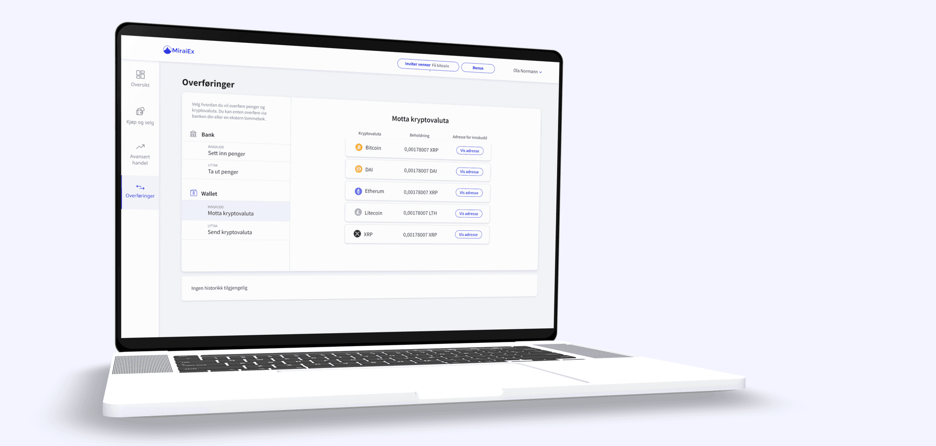Overføringer -> Wallet -> Motta kryptovaluta -> Vis adresse for valgt kryptovaluta