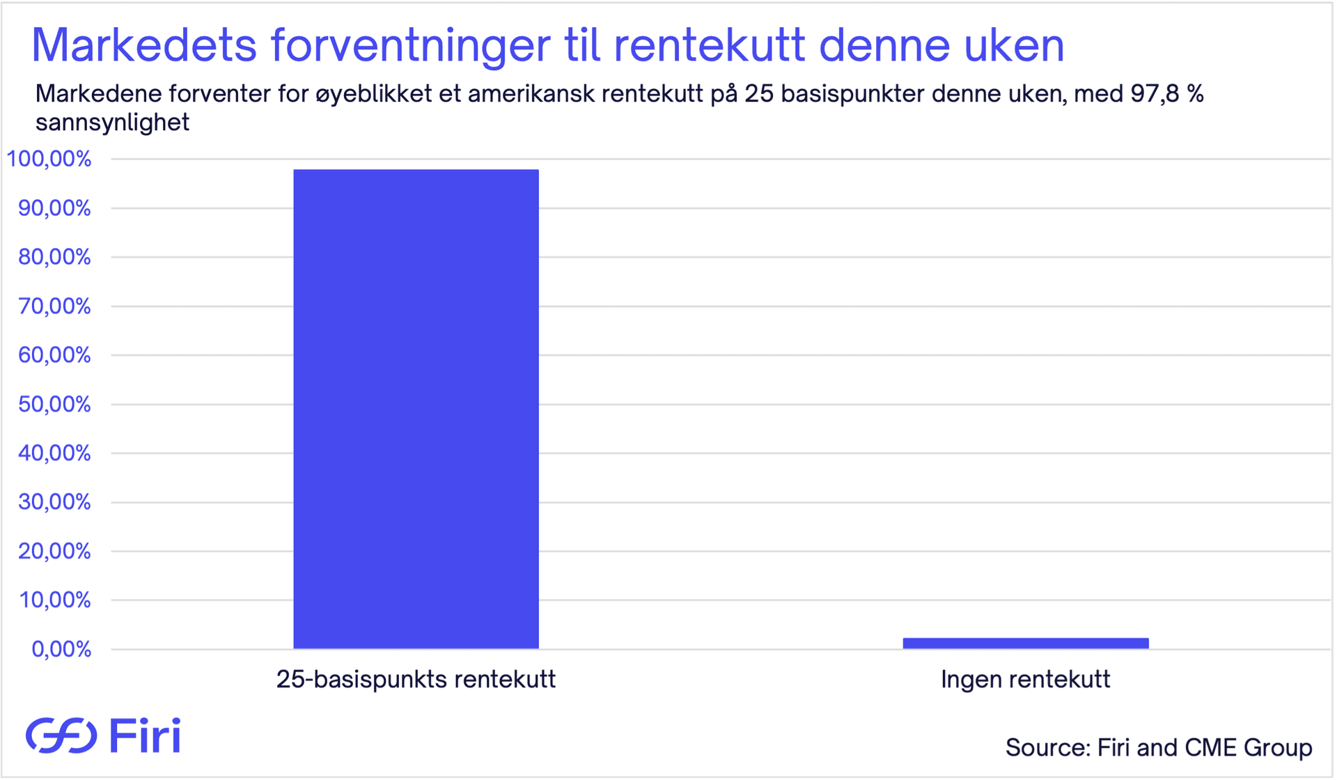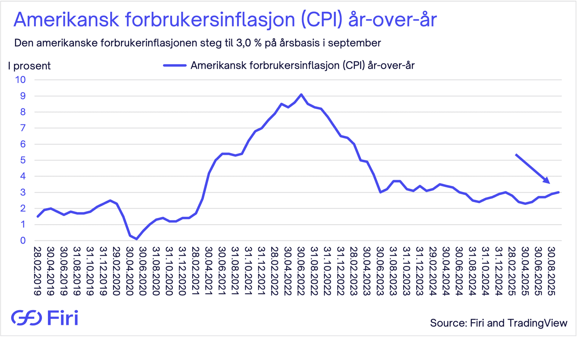 - Markedene priser med 97,8 % sikkerhet et rentekutt fra den amerikanske sentralbanken (Fed) onsdag, etter at den amerikanske inflasjonen i september traff 3,0 % mot forventet 3,1 %.