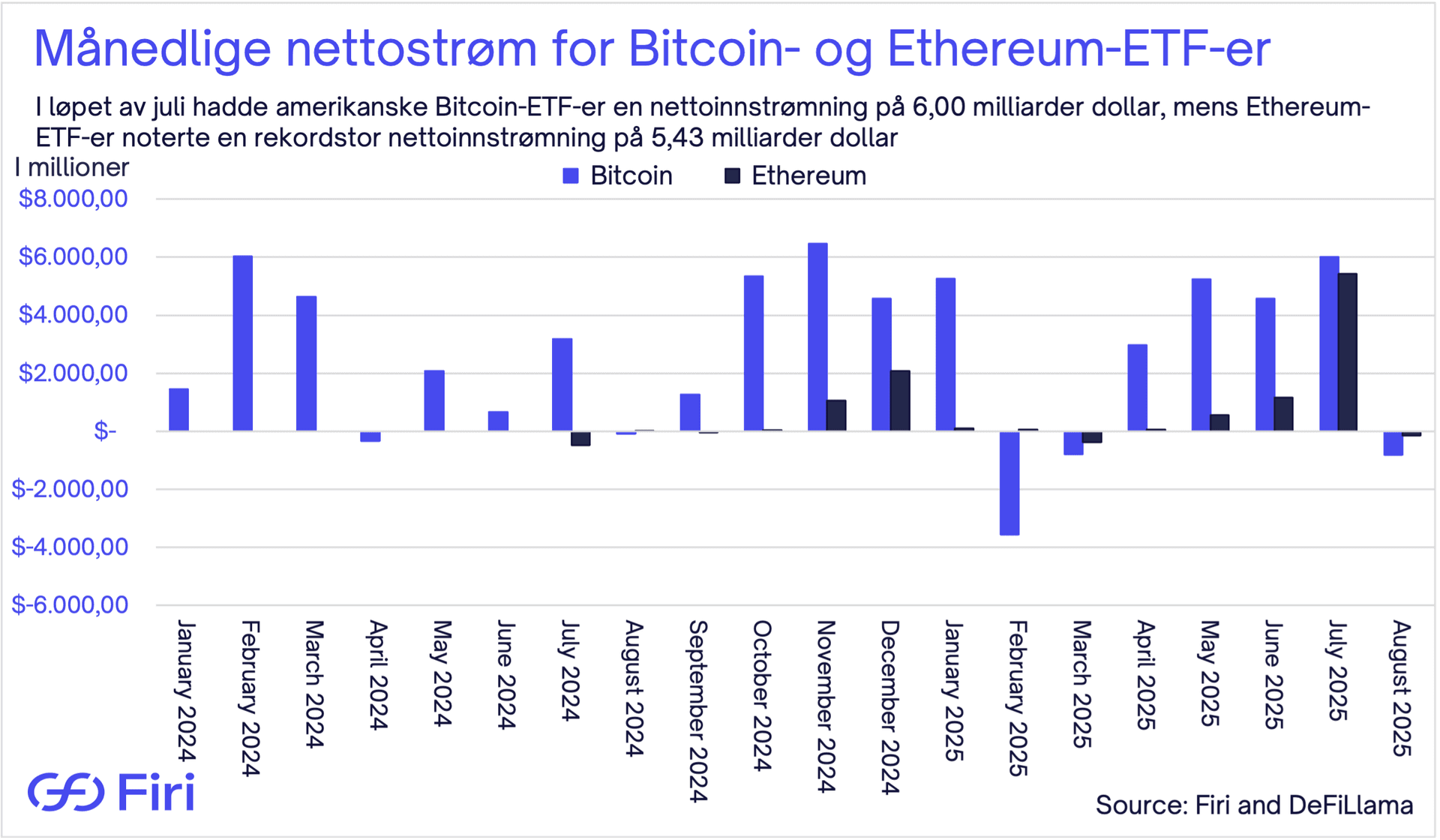 Graf 3: Månedlige nettostrøm for amerikanske Bitcoin- og Ethereum-ETF-er