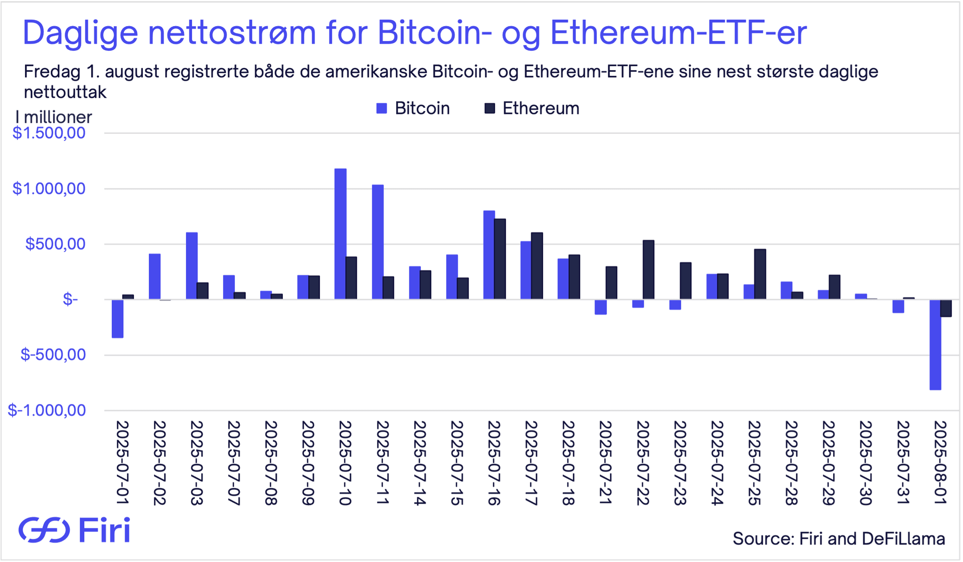 Den sterke juli-prestasjonen stoppet brått inntil videre i august. Både amerikanske Bitcoin- og Ethereum-ETF’er registrerte sin nest største daglige utstrømning for 2025 fredag 1. august. Bitcoin-ETF’er opplevde en nettoutstrømning på 812,3 millioner dollar den dagen, mens Ethereum-ETF’er så 152,3 millioner dollar forlate fondene.