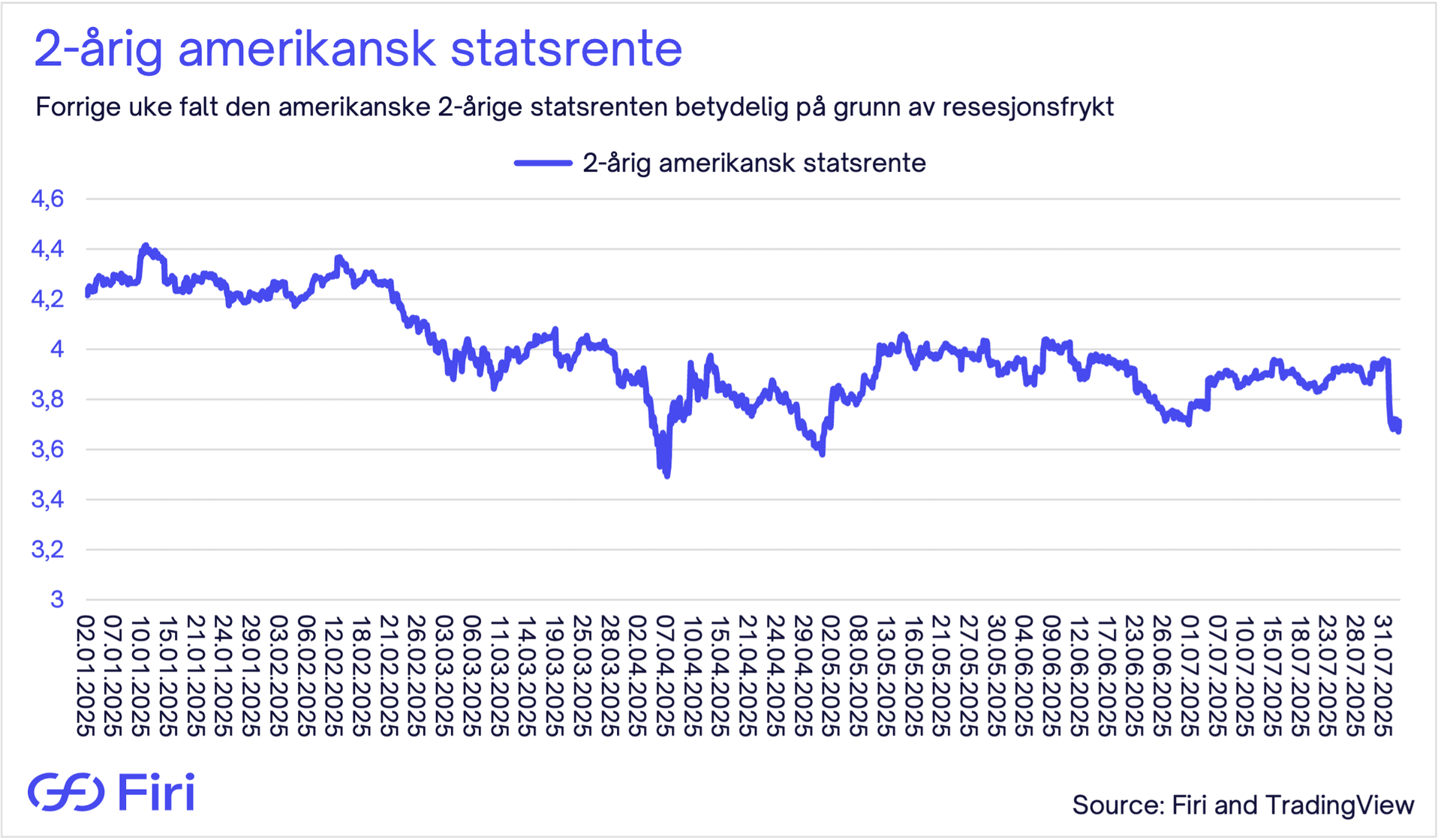 Den amerikanske 2-årige statsrentens kollaps etter fredagens jobbrapport understreker voksende panikk i markedene. Investorer forventer nå aggressive rentekutt fra den amerikanske sentralbanken (Fed) – ikke på grunn av fallende inflasjon, men drevet av bekymringer over avtagende vekst eller til og med en potensiell resesjon.