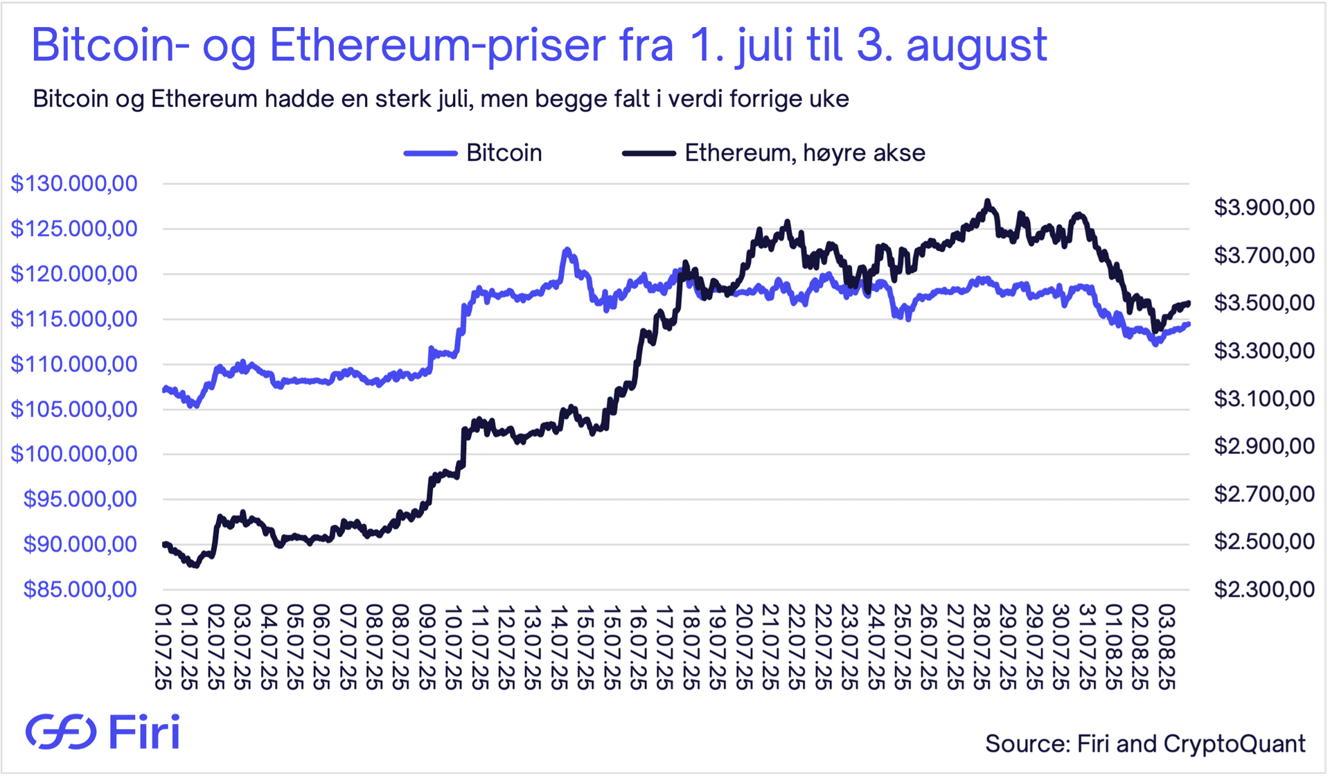 Graf 1: Bitcoin- og Ethereum-priser fra 1. juli til 3. august