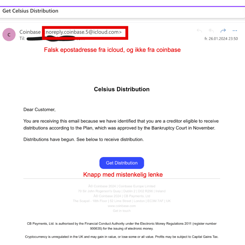 I denne eposten lokker svindlerne ofre med at de kan få en belønning som venter på dem. De utgir seg for å være Coinbase, men Coinbase vil aldri kontakte kundene sine på denne måten.